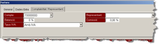 Al igual que en el punt anterior, s'ha afegit una tercera pestanya en la edició dels documents de facturació des d'on podem gestionar les informacions relatives a quina compta enviarà la factura quan la comptabilitzem, tipus de retenció i d'iva, i les dades del representant i la seva comissió per aquest document.